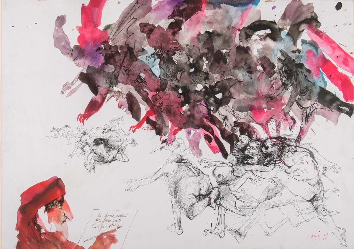 Carlos Alonso, “Que corrían mordiéndose [Those Who Run Biting Each Other],” 1968, colored wash and black ink on paper, 19 13/16 x 27 5/8 in. Blanton Museum of Art, The University of Texas at Austin, Gift of John and Barbara Duncan, 1971